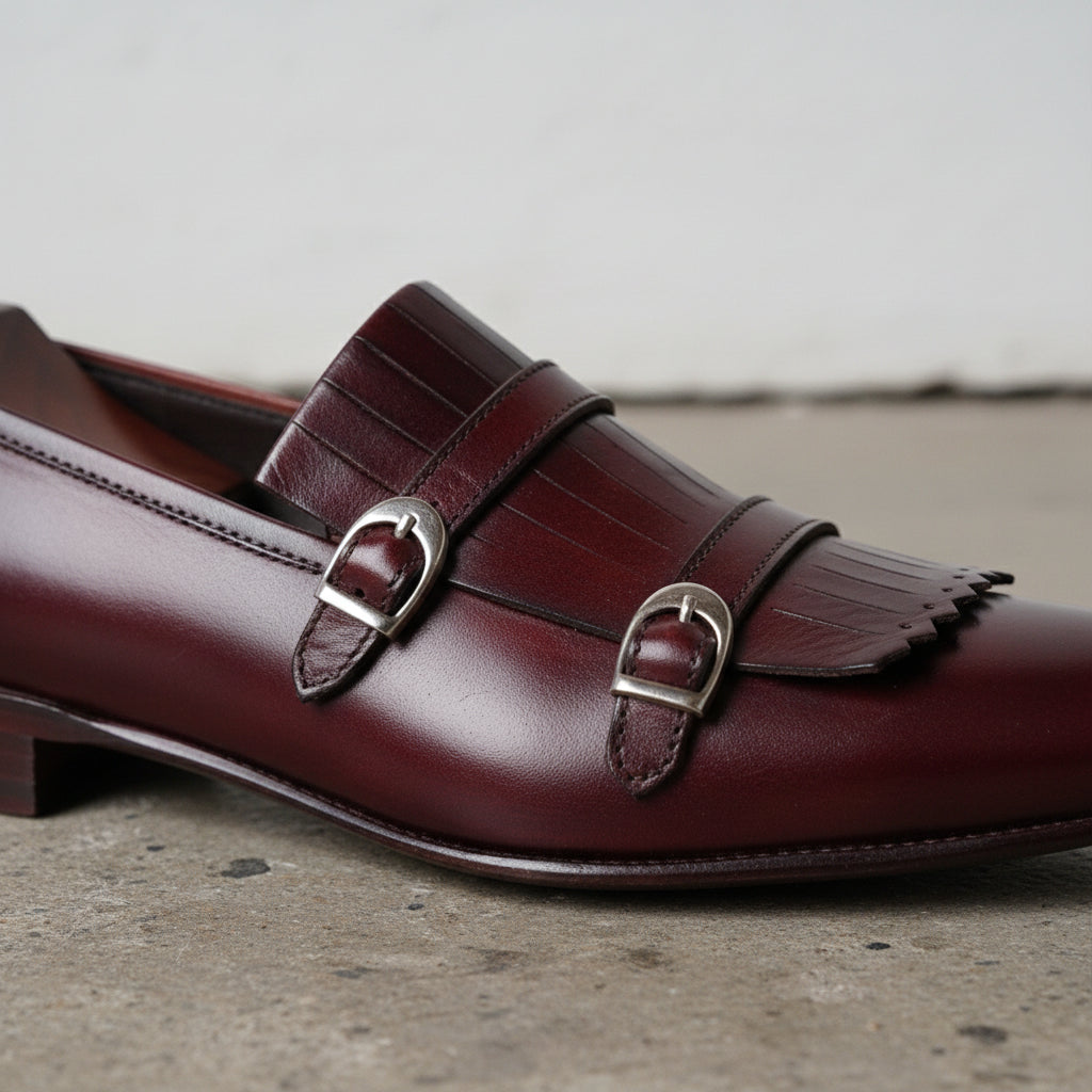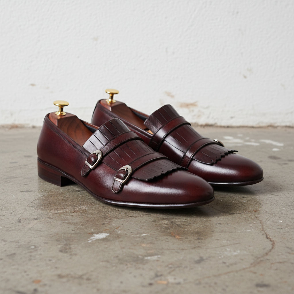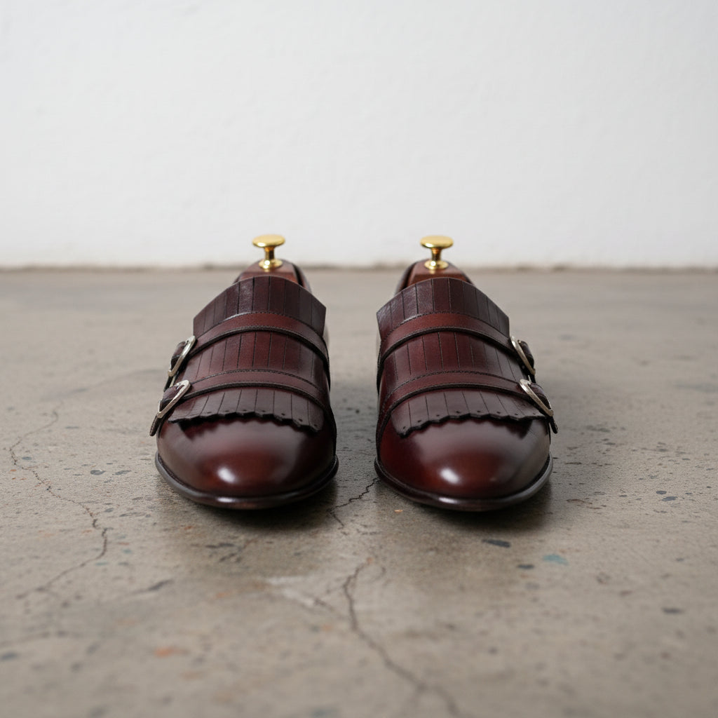 Handmade Men Brown Leather Double Monk Shoes with Fringes, Western Shoes