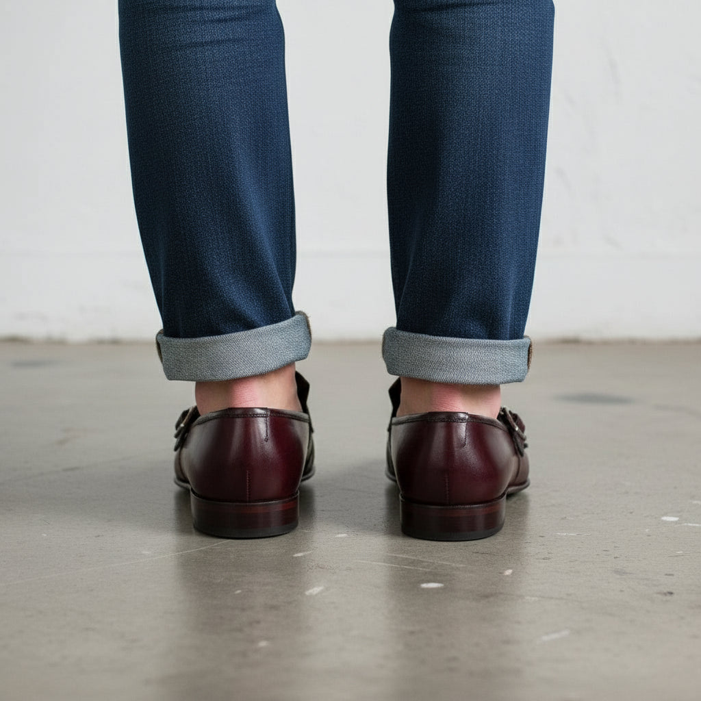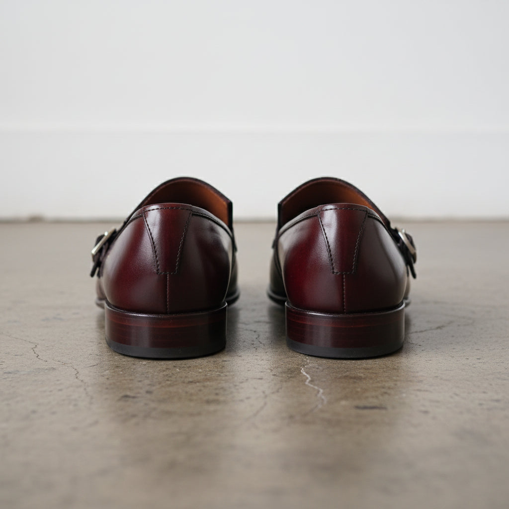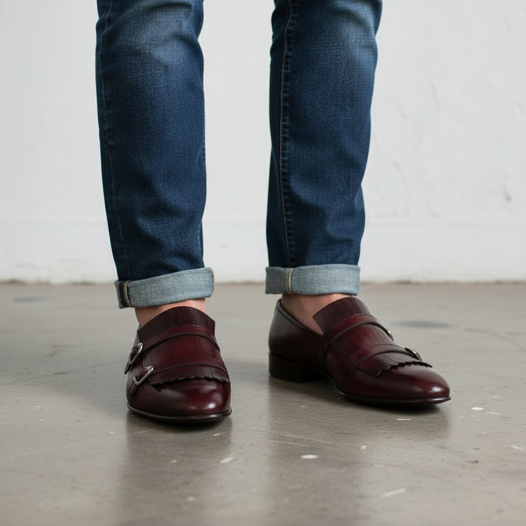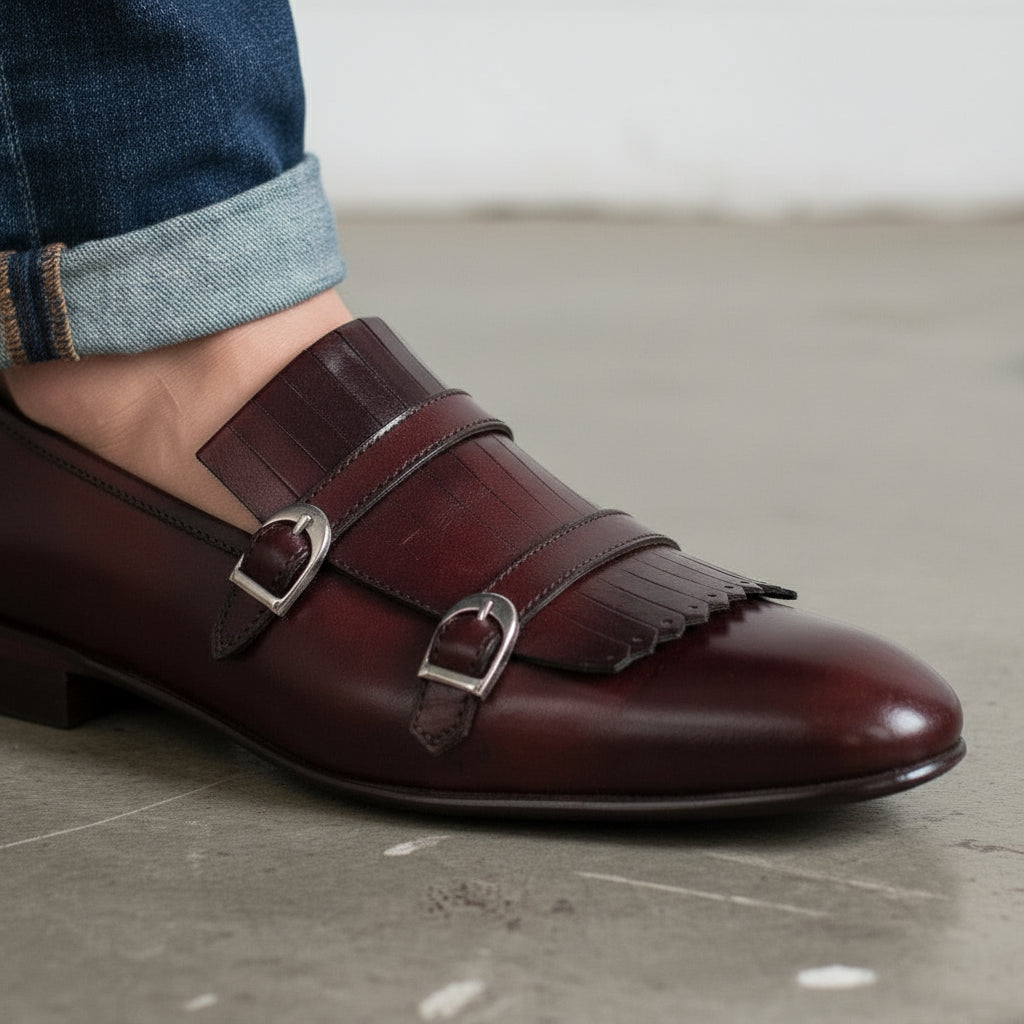Handmade Men Brown Leather Double Monk Shoes with Fringes, Western Shoes