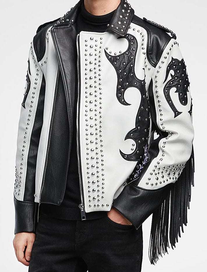 Men's Handmade Two Tone Studded White Leather Biker Jacket