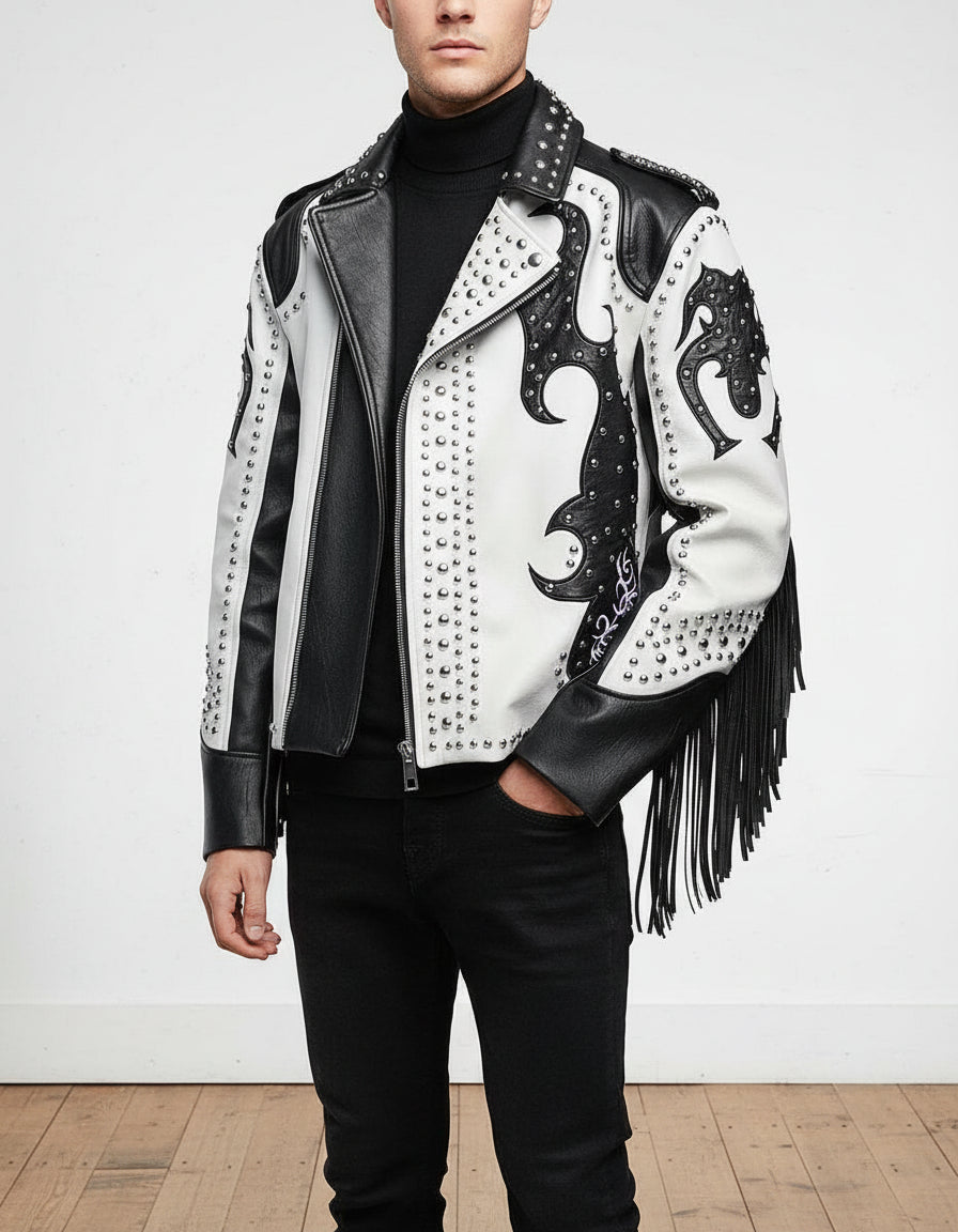 Men's Handmade Two Tone Studded White Leather Biker Jacket