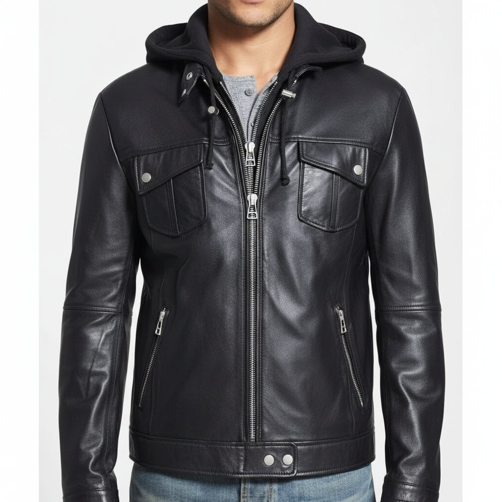 Handmade Punk Men Hooded Leather Jacket Black Biker Leather Jacket Fashion Jacket