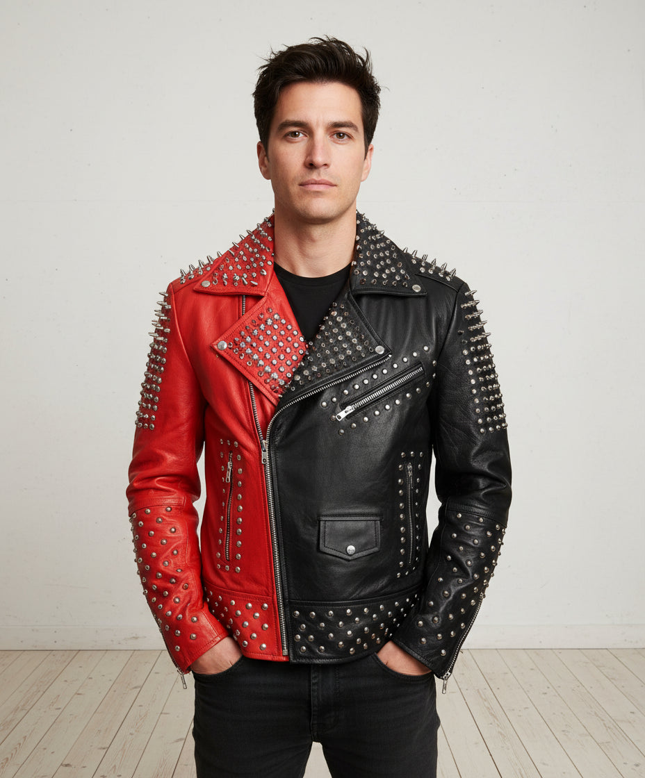 Handmade Mens Two Tone Brando Studded Punk Rock Spikes Motorcycle Biker Jacket