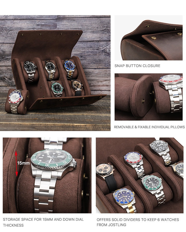 Real Leather 6 Slots Portable Watch Roll Travel Case